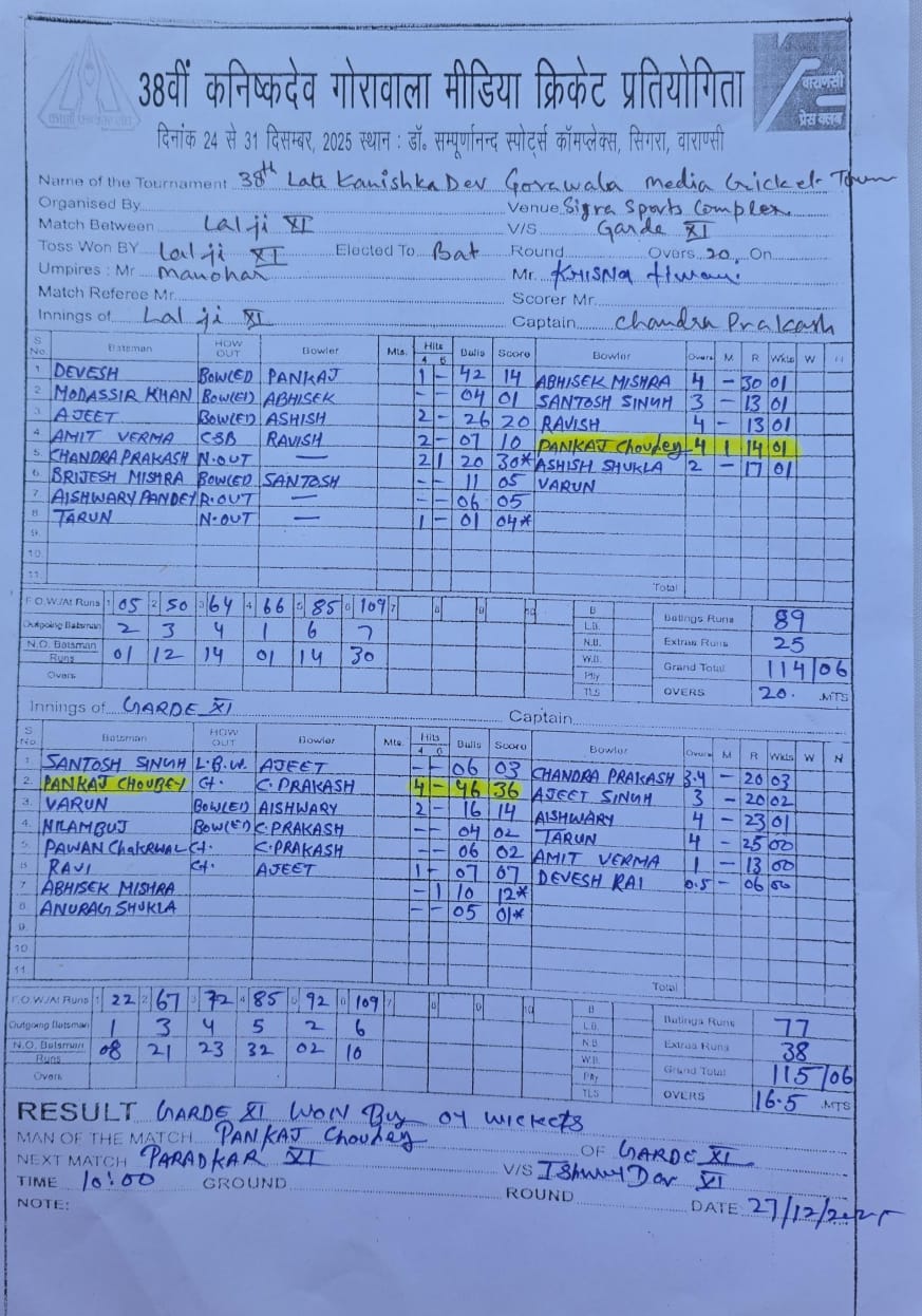 गर्दे एकादश की जीत में पंकज का बहुमुखी प्रदर्शन 38वीं कनिष्कदेव गोरावाला स्मृति मीडिया क्रिकेट प्रतियोगिता